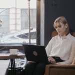 膝の上のPCで作業をする女性