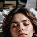 書類の山の中で寝る女性