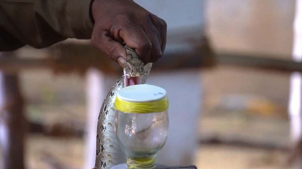 毒蛇から毒を取る男性