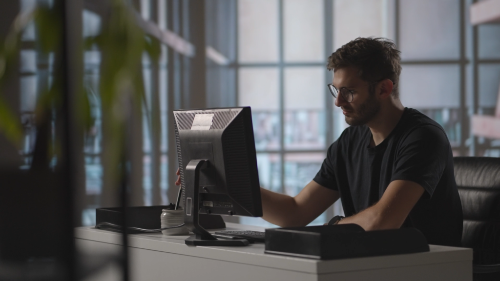 PCの前で考え込む男性