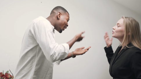 PCの前で作業している男性が周りの人たちに紙クズをぶつけられる