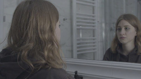 真剣・まじめ・集中鏡に映った自分を見つめる女性