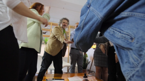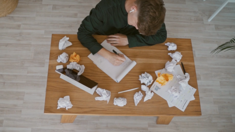 いじめPCの前で作業している男性が周りの人たちに紙クズをぶつけられる