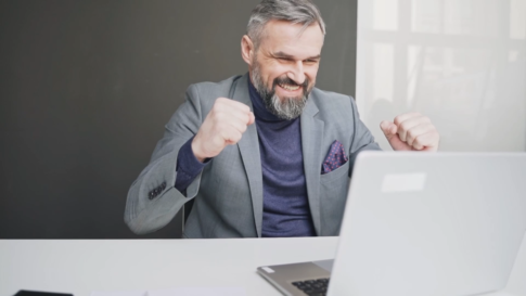 オフィス・事務所・会議室PCの前で喜ぶ男性