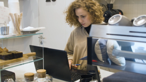女性一人カフェの売り上げ計算をする女性