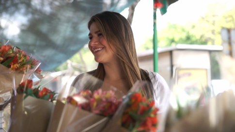 女性一人花束を見て喜ぶ女性