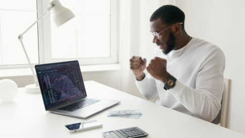オフィス・事務所・会議室PCの前でガッツポーズをする男性