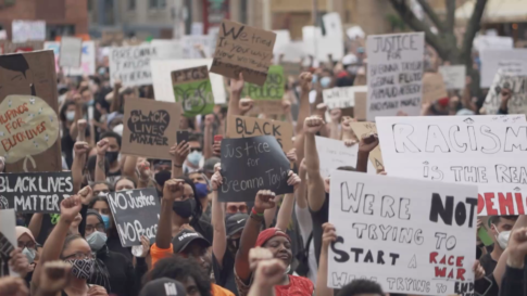 男女複数人デモをする人たち