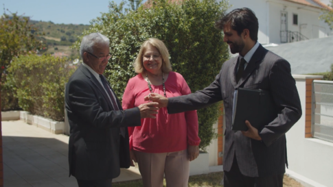 男女複数人家の鍵を渡すセールスマン