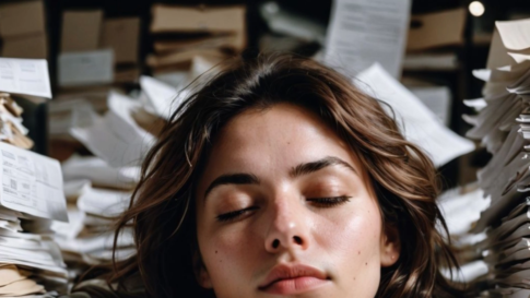 オフィス・事務所・会議室での作業・会議・打ち合わせ書類の山の中で寝る女性