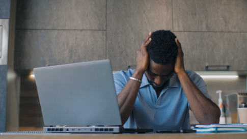 落ち込むPCの前で考え込む男性