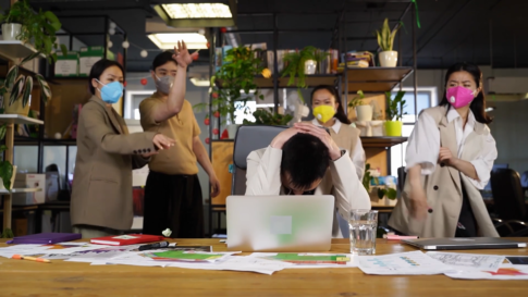 PCの前で作業している男性が周りの人たちに紙クズをぶつけられる