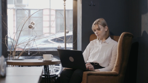 平常心・落ち着く・日常カフェで女性にに歩み寄り握手する男性