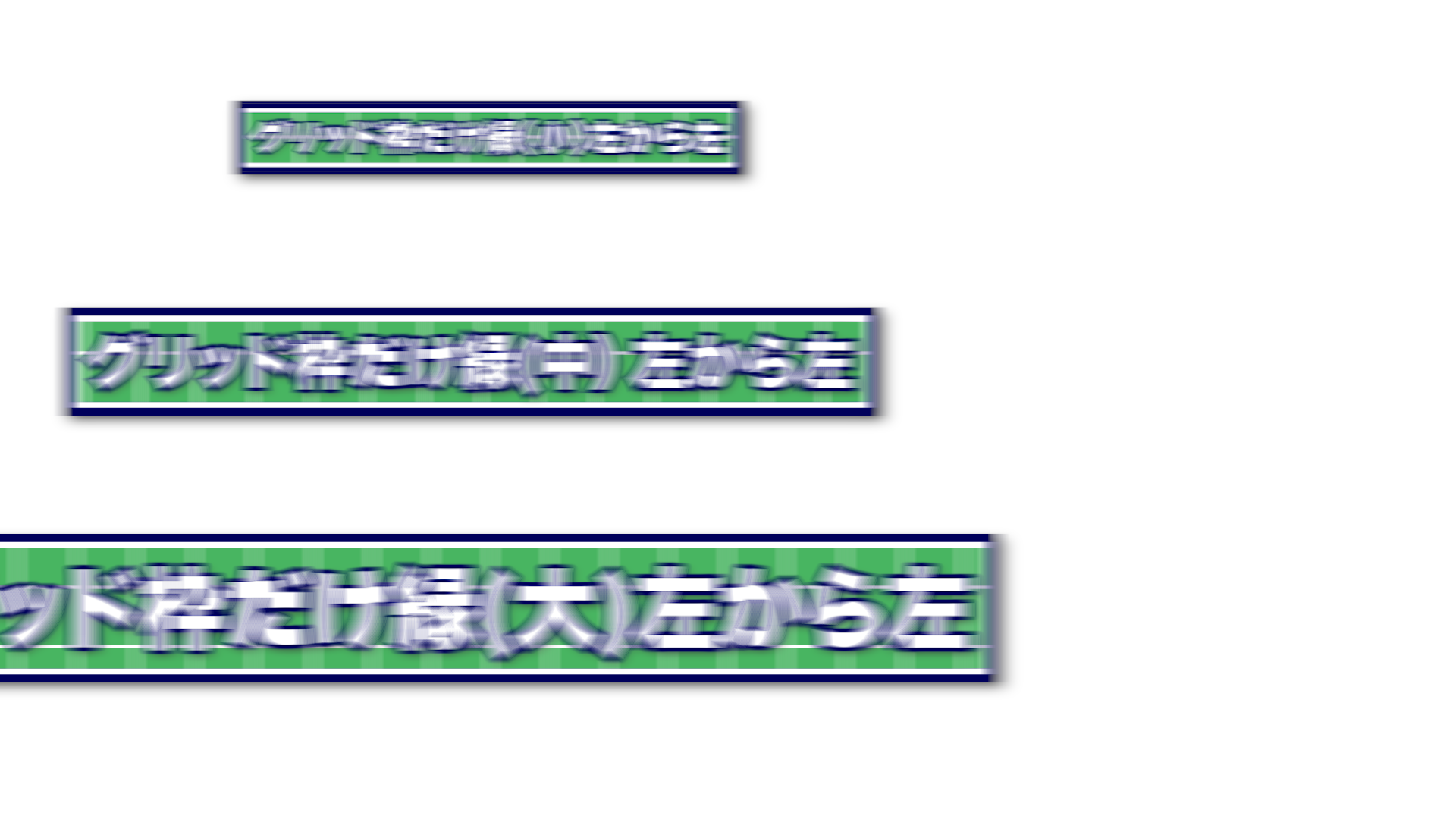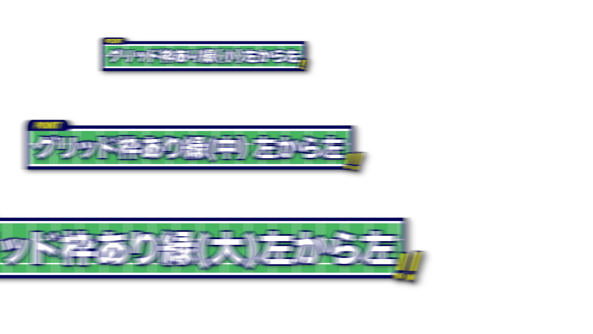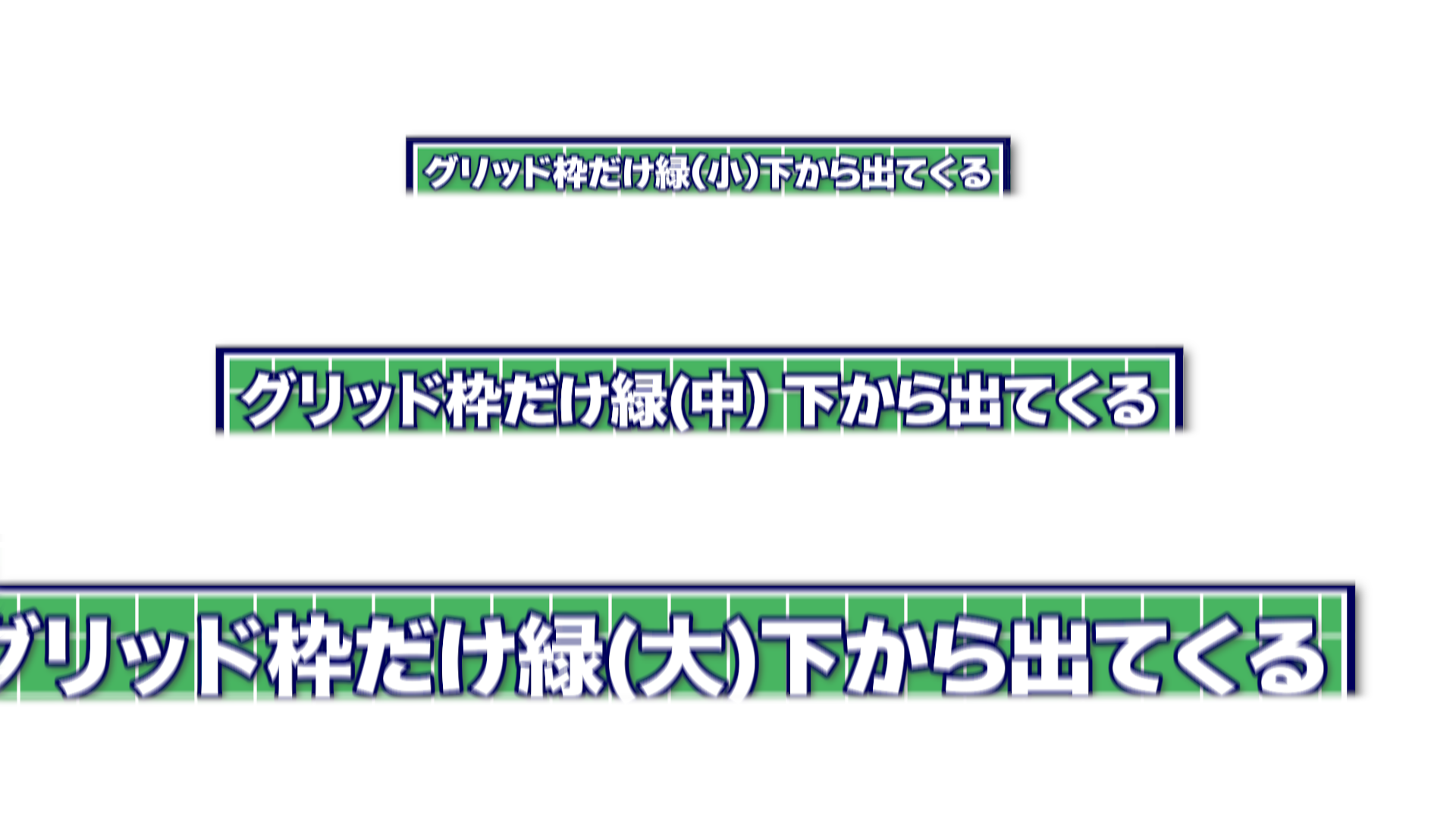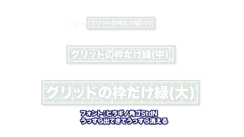 うっすら出てきてうっすら消えるグリッドの枠だけテロップ発注名小:グリッド背景の枠あり緑うっすら出てきてうっすら消える小中:グリッド背景の枠あり緑うっすら出てきてうっすら消える中大:グリッド背景の枠あり緑うっすら出てきてうっすら消える大※スマホの場合、長押しでコピーできます下...