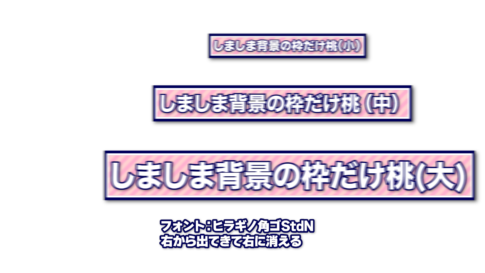 下から出てきて下に消えるしましま枠ありテロップ発注名小:しましま背景の枠あり水下から出てきて下に消える小中:しましま背景の枠あり水下から出てきて下に消える中大:しましま背景の枠あり水下から出てきて下に消える大※スマホの場合、長押しでコピーできますフォント:遊ゴシック...