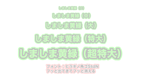 フッと出てきてフッと消えるしましまテロップ発注名小:しましまテロップ黄緑フッと出てきてフッと消える小中:しましまテロップ黄緑フッと出てきてフッと消える中大:しましまテロップ黄緑フッと出てきてフッと消える大特大:しましまテロップ黄緑フッと出てきてフッと消える特大超...