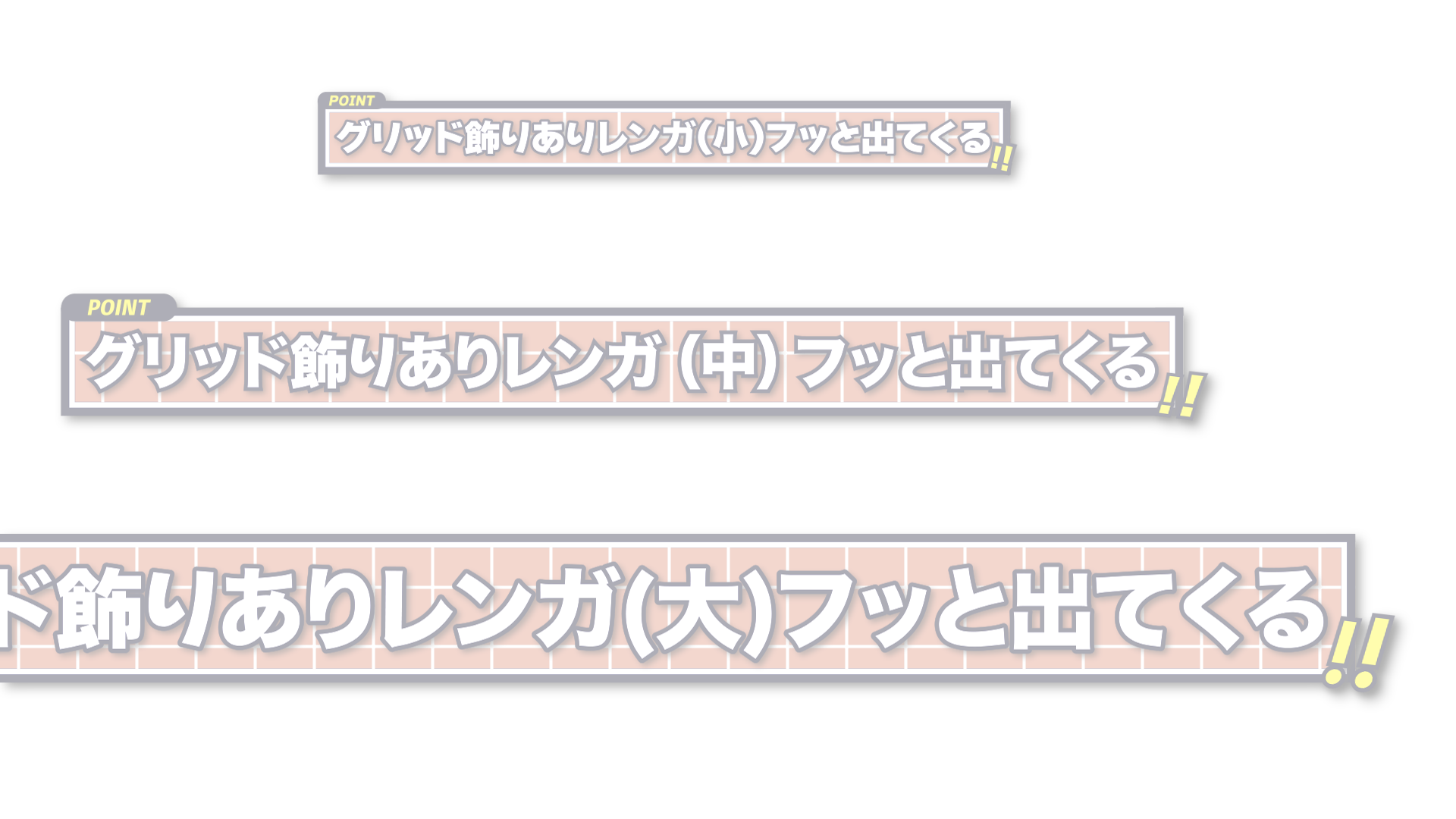 左から出てきて左に消えるグリッドテロップ発注名小:グリッド背景の枠、飾りありレンガ左から出てきて左に消える小中:グリッド背景の枠、飾りありレンガ左から出てきて左に消える中大:グリッド背景の枠、飾りありレンガ左から出てきて左に消える大※スマホの場合、長押しでコピ...